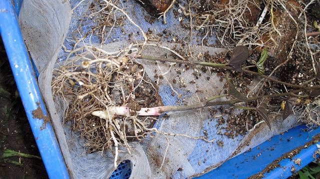 遅咲きのカット芋の芽が伸びてきたので定植しました。その前に1昨日の台風で倒れかけた支柱の立て直しを実施しました。カット芋は約40個が芽をだしています。二つ芽を出している芋が1個ありました。小さい芽をカットしました。蔓と芋(白い部分)が別々に大きくなるのです。
