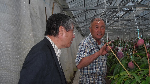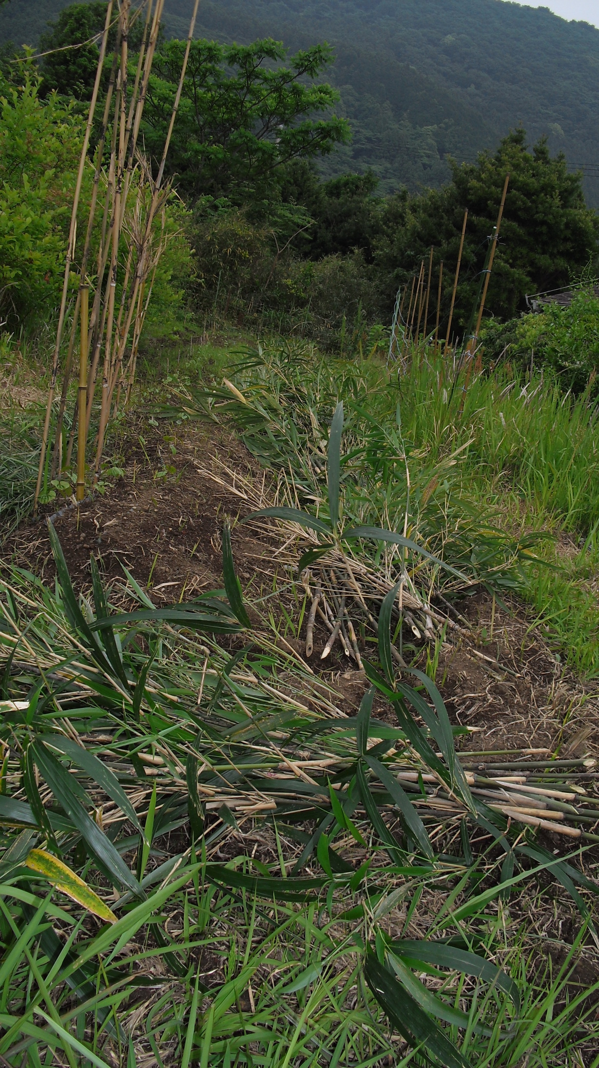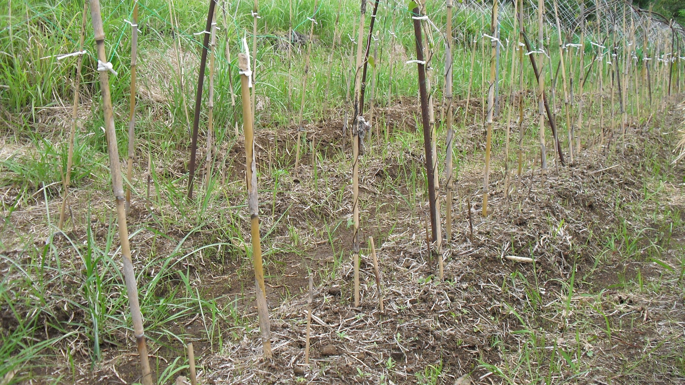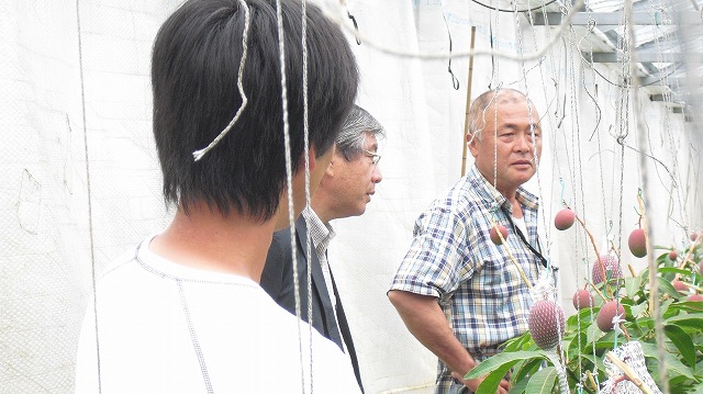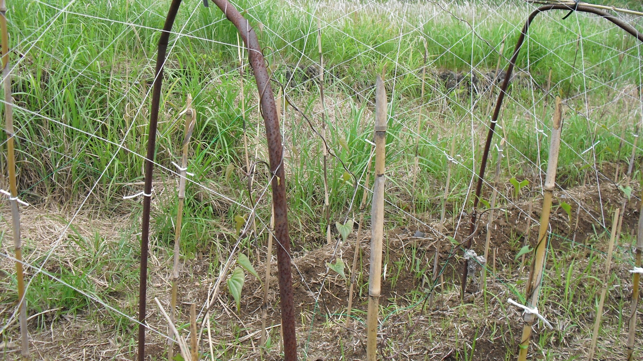 朝小雨でしたが、Bさんを下田:ペリーロードに案内しました。帰路大雨になりました。南国風のスコールに似た強い雨でした。夢センに一旦戻り雨の止むのを待ちました。09:00BさんとI君と一緒に土屋さんのマンゴーハウスを訪ねました。かなり大きくなっており、土屋さんがネット掛けをしていました。もう1,500個ほどにネット掛けを終えているとのことでした。その後,Bさんを三段滝、ばあちゃん農場に案内しました。I君はその間に昨日の堤圃場のムカゴの蔓養生の竹刺しを行ってくれました。カット芋の定植はIDさん田植えで多忙の為来週以降に実施することにしました。