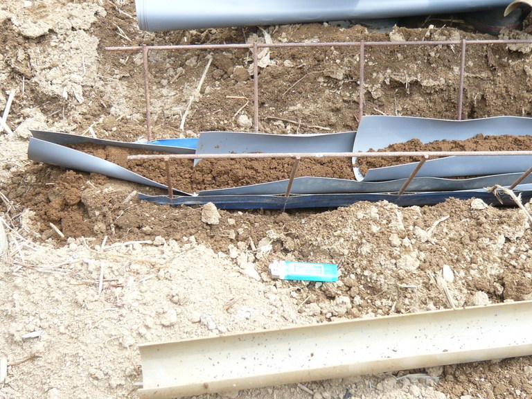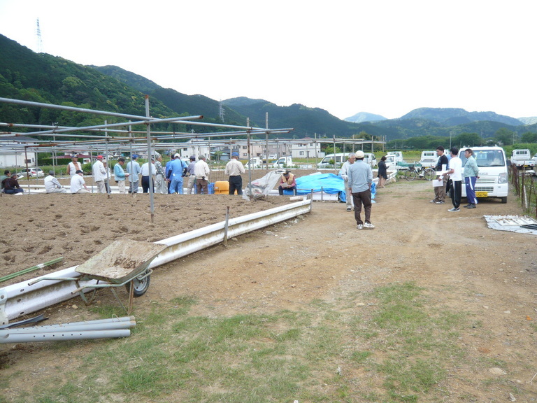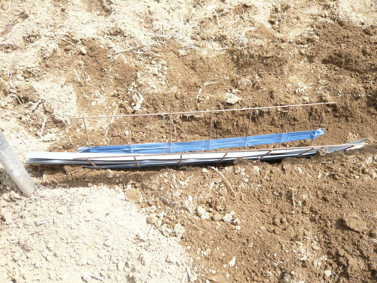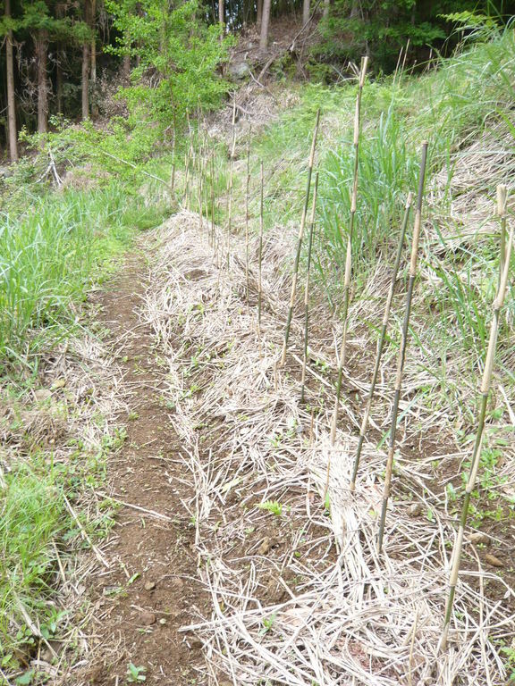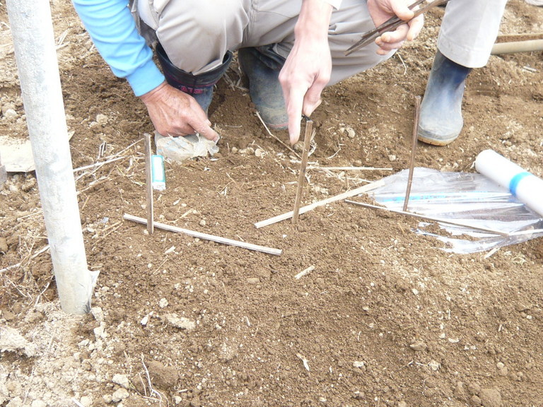 マルチは幅95cmのものを30cm単位にカットして使用します。我々はマルチを使用していません。20cmt以上の1本種は写真のようにハの字型に置くそうです。政田農園のビデオではまっすぐに重ねて置くと教わりました。いろいろな方法があるのです。