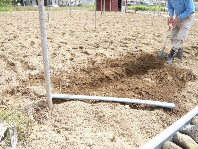 畝シートの埋設は定植前10日前くらいでやっているそうです。シート埋設後マルチ(薄さ0.2mm-白)を被せます。これはシートへの水の浸入の防止と雑草の防止、病気予防に必要です。その上に3cmほど覆土しておきます。定植後に約10cmほどの土を被せます。芋の最初のヒゲは先が鋭くマルチのビニールを突き破り芋はシート内にて大きくなるそうです。