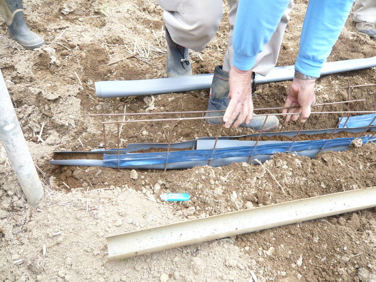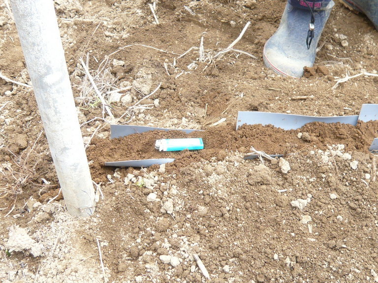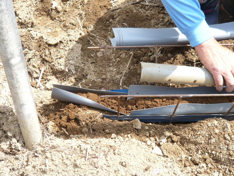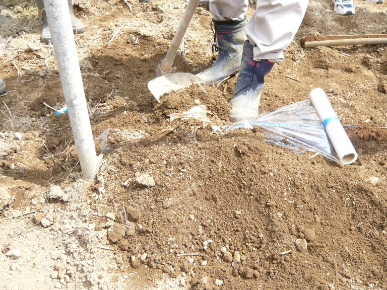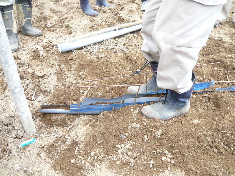 畔シート方式ではシート(幅:20cmm程度)を埋める際に幅約1mの金櫛2個を使い写真のようにシートを挟み、周りの土を踏み固めるそうです。私たちはこのような櫛は使用していません。シート内の土は約1kgほどで足りるそうです。土入れのエンビパイプを別に用意していました。先頭が広く土が多く後尾は狭く土が少なくて良いそうです。芋の成長に従い先頭部の土が底に移動するのだそうです。