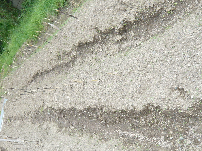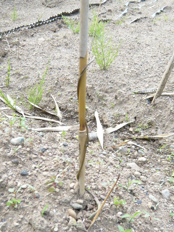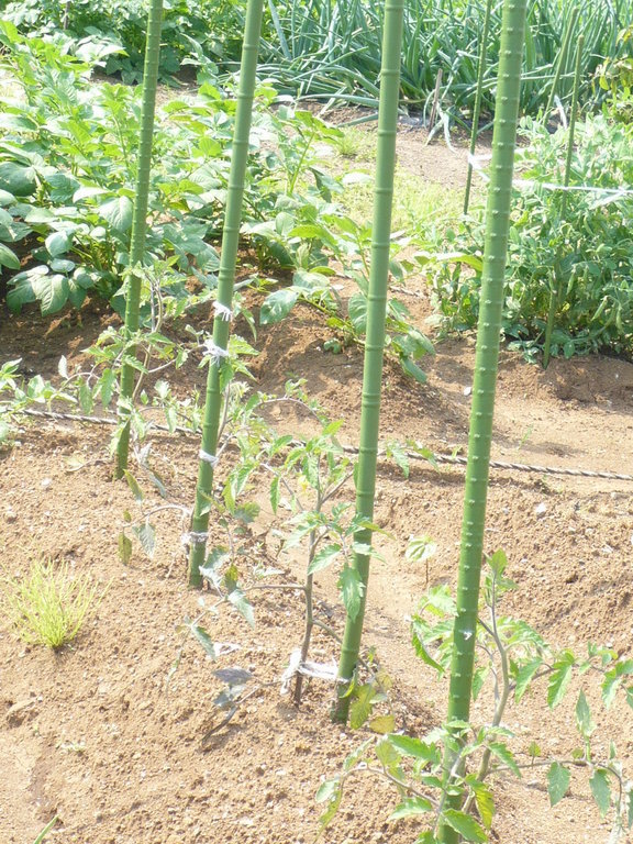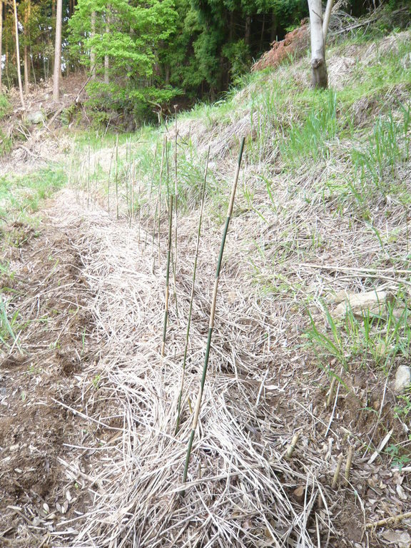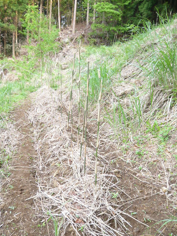 土屋農園の1段目の蔓も8本地上に延びました。長い蔓は30cmほどあります。昨日採取した信夫竹を支柱として立てました。(写真上の2列) 2段目の圃場にも小さい蔓が地上に延びました。これは4月20日に定植した1本種です。(写真:下段)