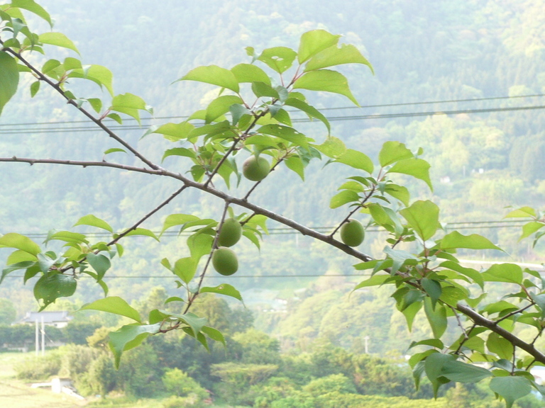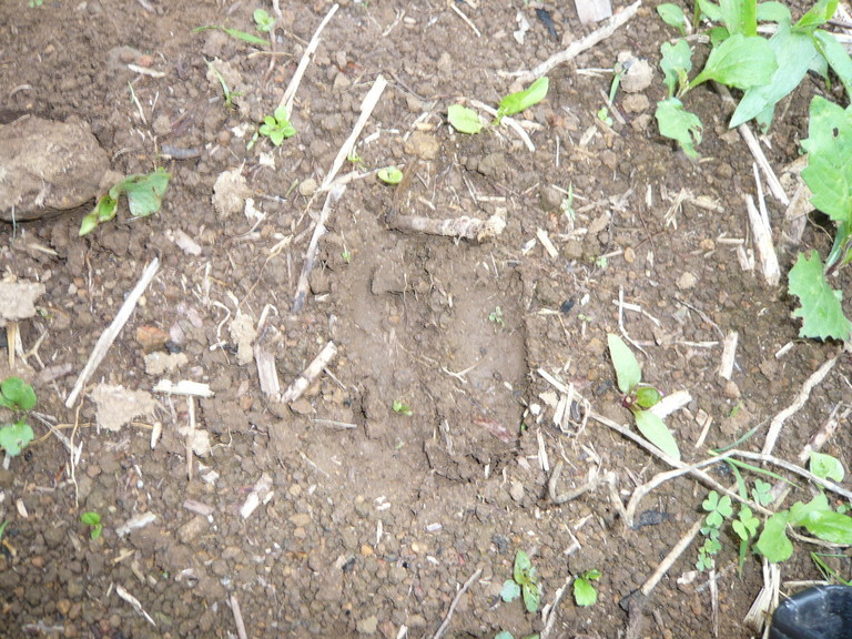 写真上の足跡がありました。土屋さんに診てもらいました。これは鹿の足跡だそうです。土屋さんは猟師なので猪や鹿の足の形を熟知しています。この圃場には電柵は張っていません。そろそろ対策を考える必要があります。梅の木には梅の実がビー玉サイズまでに成長していました。