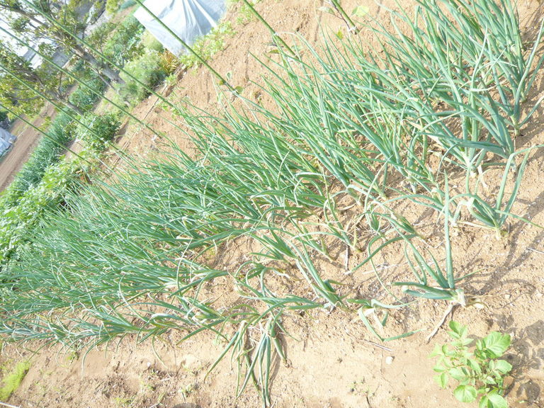 トマトに開花が見られました。玉葱も大雨(風)で一部倒壊が見られますが概ね順調です。ジャガイモも10cmほどに成長していますが、隣の畑に比べると小さいです。南瓜の1本は蔓が伸び始めました。