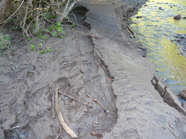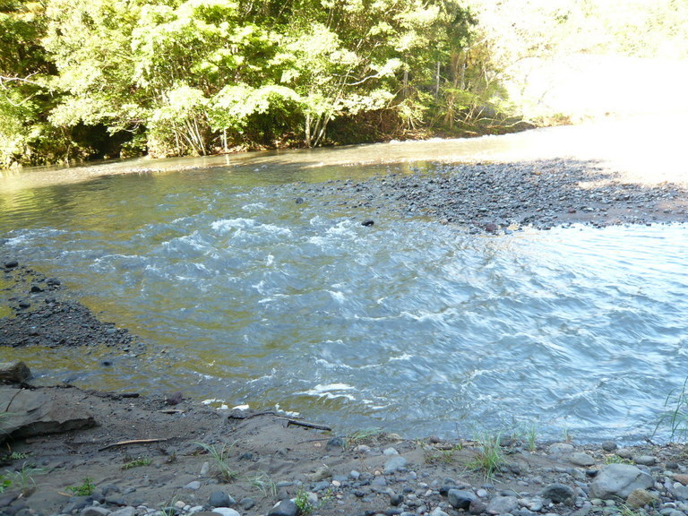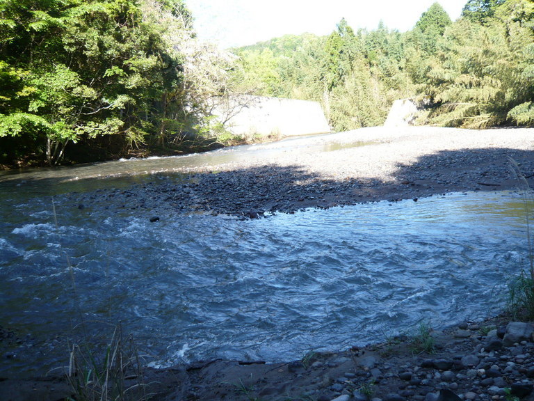 一昨日までの大雨の影響を見るため、自然薯のパイプの砂を採取した砂防ダムを見てきました。川が二つに分かれ水が流れています。中州が孤立していました。前に採取した砂地が大きく裂かれています。