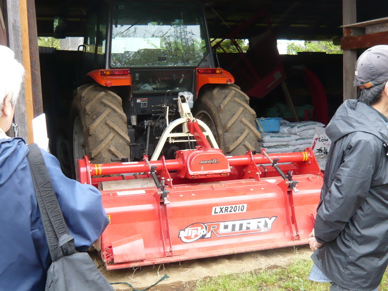 耕耘機類の倉庫兼作業場を見せてもらいました。多くの種類の耕作機器が格納されています。今年の牛の飼料となるトウモロコシの種がバケツに入れてあります。