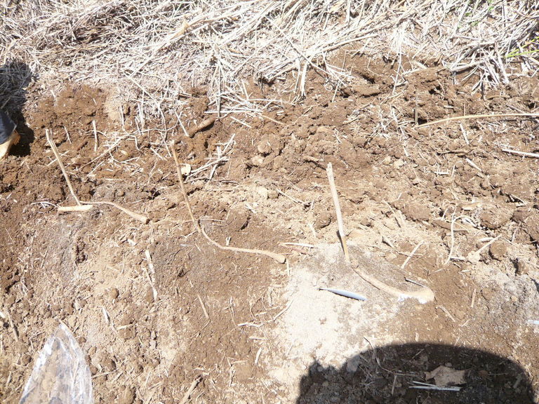 最後にムカゴを約50個ほど埋めました。波型アルミ版を斜めに埋め込みその先頭2pの付近にムカゴを深さ3pの深さに埋めました。その後、覆土します。Aさんがフルイを使って細粒土を被せてくれました。