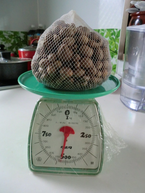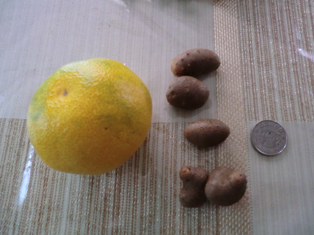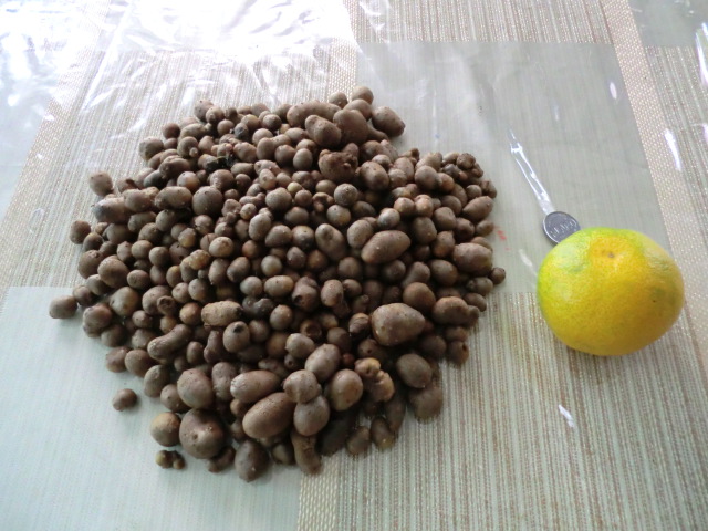 採れたムカゴを机の上に重ねました。約300個ほどです。大きいものは長さが2cmほどあります。平均φ10mm程度のサイズです。