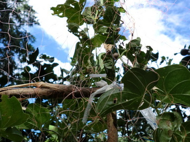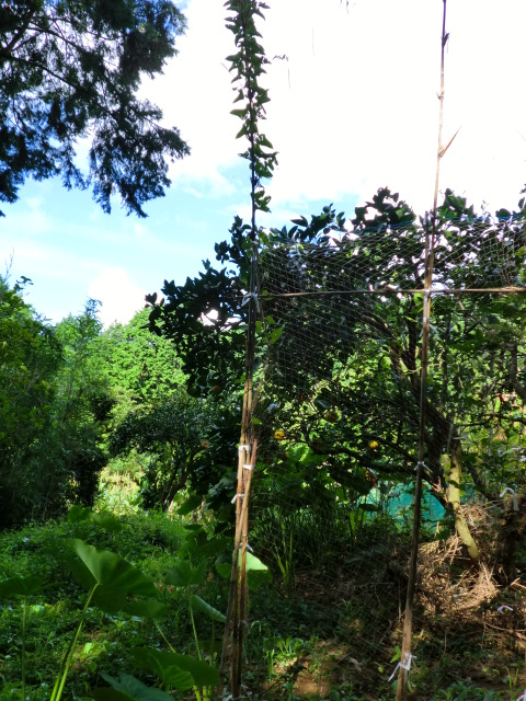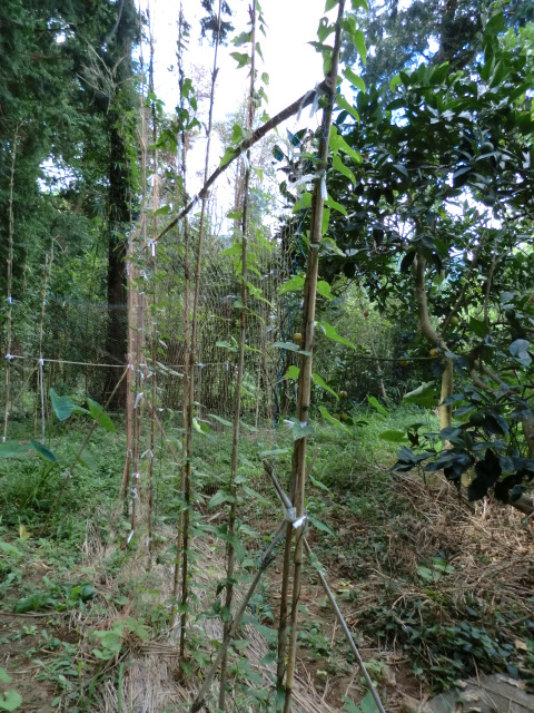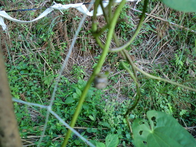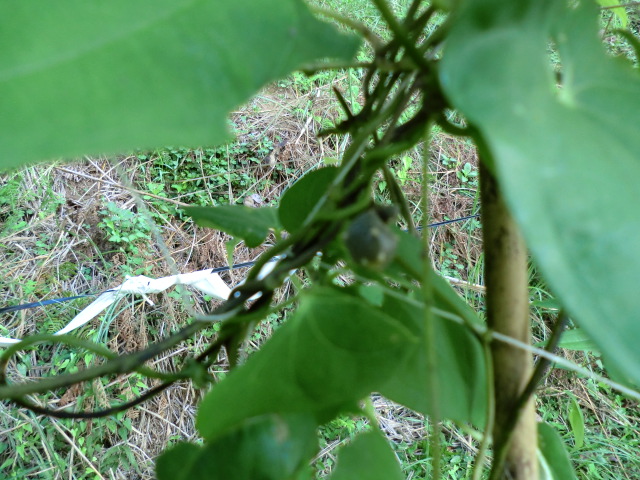 Happy LifeのHさんの家庭菜園の自然薯を見せて貰いました。ムカゴ2個ついています。蔓が3m以上に伸びています。定植したのは7月初めで遅かったのですが良く成長しています。