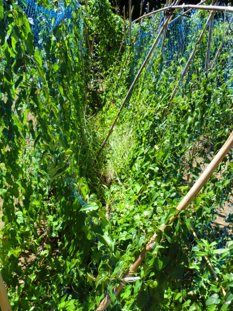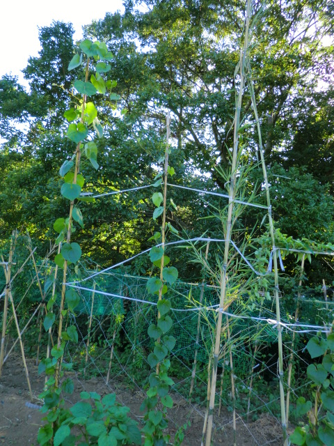 合間を利用して少しの時間で、とげどころの蔓の養生として信夫竹を支柱として立て、支柱間を紐で結び蔓が紐を通して他の支柱にも伸びるようにしました。高い蔓は4mあります。