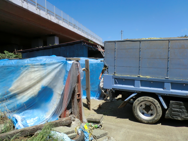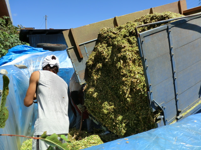 今日は2つ目のサイロへの飼料の詰め込みです。サイロには事前にブルーシートとビニールシートを敷き詰める養生が必要です。これを手伝いました。飼料用トーモロコシを刻んだものをトラックで運び込みサイロに敷き詰めます。