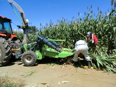 トーモロコシのコンバイントラクターが大活躍です。このトラクターは2畦のモロコシをコンバインできる優れものです。モロコシ畑をあっという間にコンバインしてトラックの荷台に積み込みます。畑の端のモロコシや倒れてしまったモロコシは手作業(鎌)で刈り、手作業でコンバインに噛ませます。コンバインして2トントラックに積み込みまで約30分で完了します。