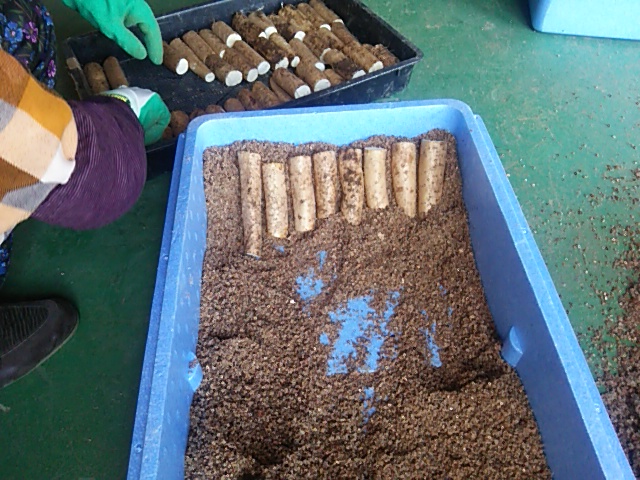 昼はランチをご馳走になり、午後からは育苗箱へのカット薯の埋めこみです。地元の川砂をバーミキュライトと混ぜて(半分づつ)育苗箱に少しずつ入れて種イモを並べて行きます。先頭部分の細長い種薯は横に並べて中央部のカット薯は斜め縦に並べて行きます。容器は特製の容器で丁度50個の種イモ(+3個ほど)を埋めて行きます。これは50個単位の芽出し済みの種イモを販売するためです。14:30実習終了。種薯90kgを車に乗せて平塚には無事に18:00に帰り着きました。Sさんは6,000本の自然薯を栽培しており、種薯の栽培は4,000本だそうです。Sさん:大変参考になりました。ありがとうございました。
