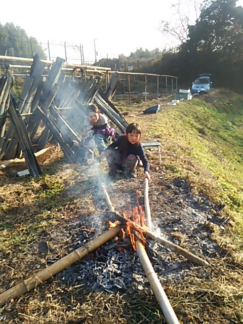 東京から娘が横須賀から姪の一家が餅つきに訪れました。午後、孫と子供を連れて第一圃場の自然薯掘りを行いました。子供の力でも簡単に薯掘りができます。暖を取る為に圃場脇でたき火をして焼き芋を作りました。ホッカホカで孫が美味しそうに食べてくれました。