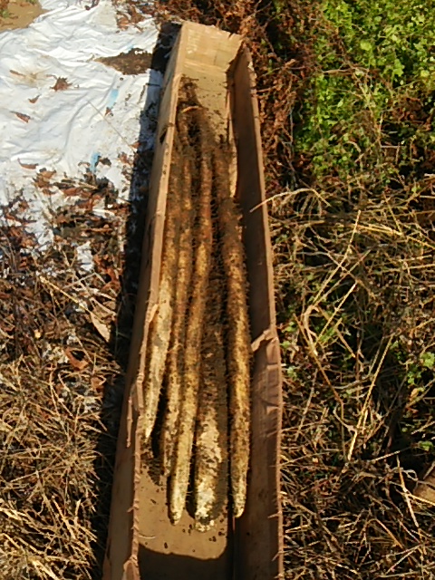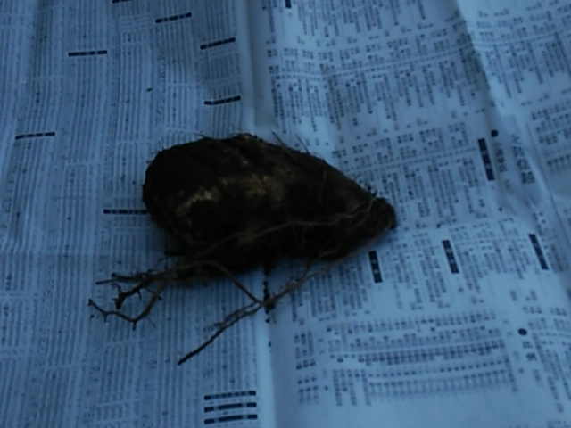 霜が降り始めたので約10本のヤマト薯を掘り上げてしまいました。この薯も粘りがあり種薯1本当たりの収量(5−8kg)が多く来年は本格栽培したいと計画しています。この薯は自然薯に比べ寒さに弱い特長があります。先のブログにアドバイスいただぃたので、保存方法を模索しています。1個づつ古新聞紙にくるんで掘穴(温度0度以上?)、米保存冷蔵庫(温度:10度程度)そして温室ハウス内に保存を試行してみたいと思います。また、古新聞紙に包んだ物を数個単位でビニール袋に入れて上部を縛ることもそれぞれ保存してみます。