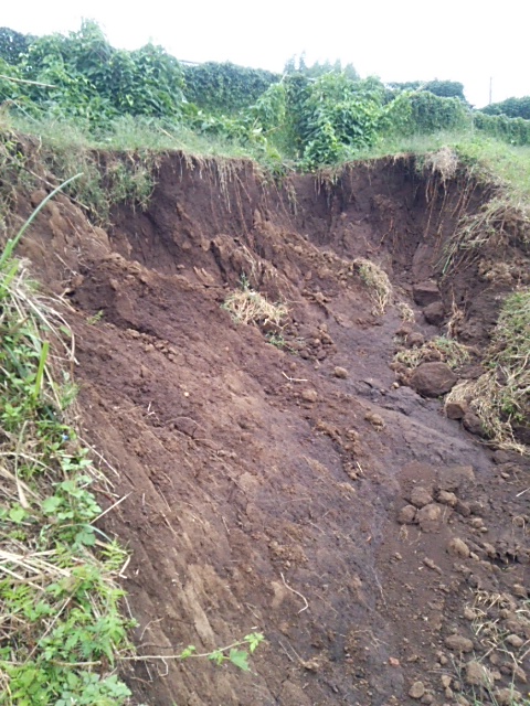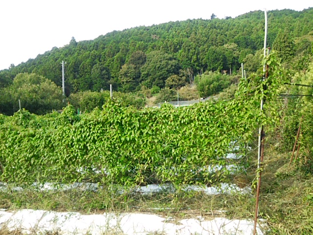 朝、圃場に行きました。先日の大雨での第一圃場の下側土手の土砂崩れを観察しました。幅5m高さ3mの土手が下の畑までずれ落ちています。農道は橋の手前で交通止めになっています。橋の脇が雨で陥没して舗装工事中です。川に手前にある第三圃場は川から溢れて押し流された草木がネットに引っ掛かっています。幸いに蔓葉は切れていませんが、畦の上まで浸水していたことが観察できました。イチョウ薯は自然薯のネットに倒れかかっていますが、蔓葉は切れていないためそのままにしておきます。今度の台風19号は風速30m以上が予想されていますので心配です。