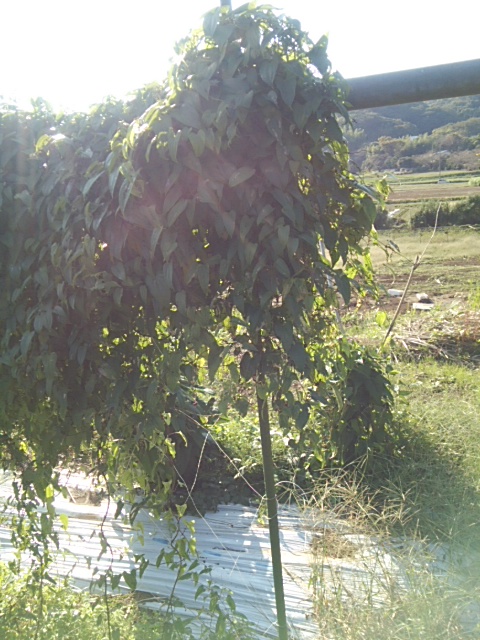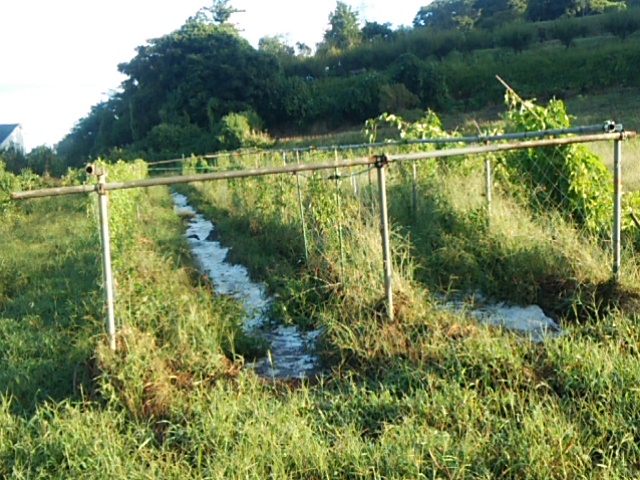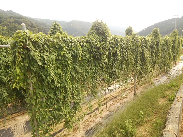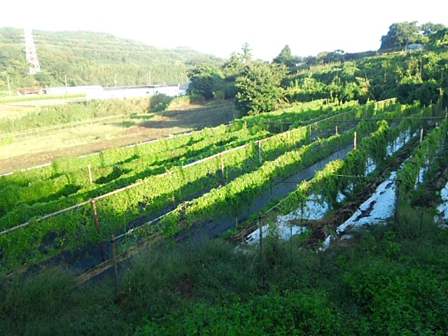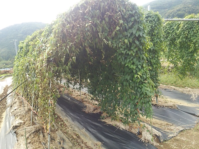 昨日から午前中から降り始めた雨は深夜に台風19号の強風に変わりました。風速25mの強風が吹き荒れました。今朝圃場に行きました。幸い、蔓葉ネットの倒伏はありませんでした。ムカゴが畦間の防草シートの上に散らばっていました。第二圃場は単管パイプを使用せずイボ支柱だった為30度くらい傾いています。(が、蔓葉の切れはありませんでした。) 不動川に近い第二圃場は畑に水が残っており長靴で歩くのがやっとです。蔓葉ネットの倒伏はありませんでした。安心しました。来週は試し掘りを予定しています。