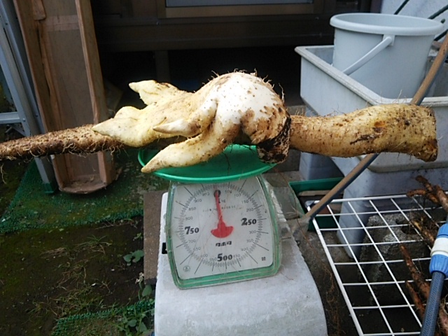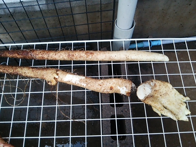 予定より少し早いですが、日曜ー月曜に八ヶ岳の友人訪問の為、平塚第一圃場の自然薯を試し掘りしました。最初に定植した第一畦の端から2本を掘ってみました。蔓葉はまだ青々としています。1本目は600g、2本目の薯はパイプの途中から地中に20cmほど伸びていました。パイプの持ち上げ時に誤って折れてしまいました。薯掘り棒を使って地中の薯を掘り起こしました。帰宅後、水洗いして陰干ししました。重さを量りました。2本目は丁度1kgありました。来週末から本格出荷します。