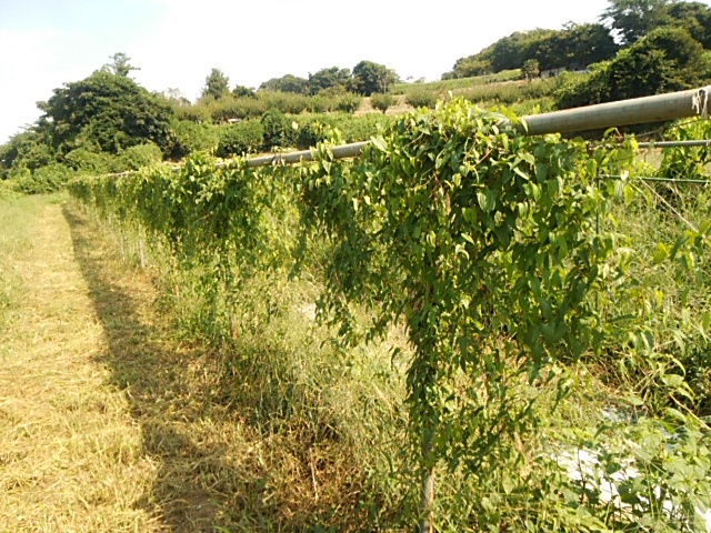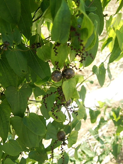 第一圃場の観察をしました。ムカゴが大きな実を付けてきました。30個ほど採取しました。物置の日陰で網袋に入れて吊るして置きます。第三圃場の畦内の草取りは自然薯の蔓を抜くリスクを回避して雑草はそのままにしました。イチョウ薯も生育は順調です。