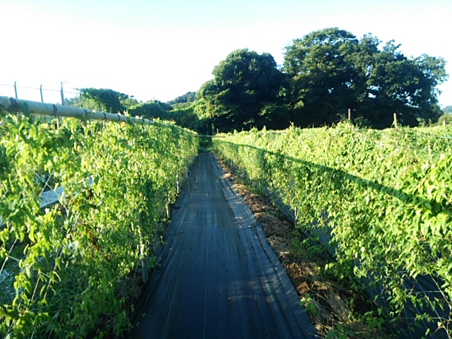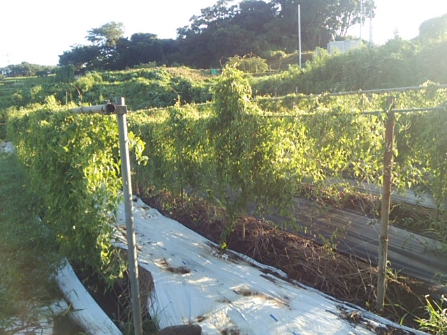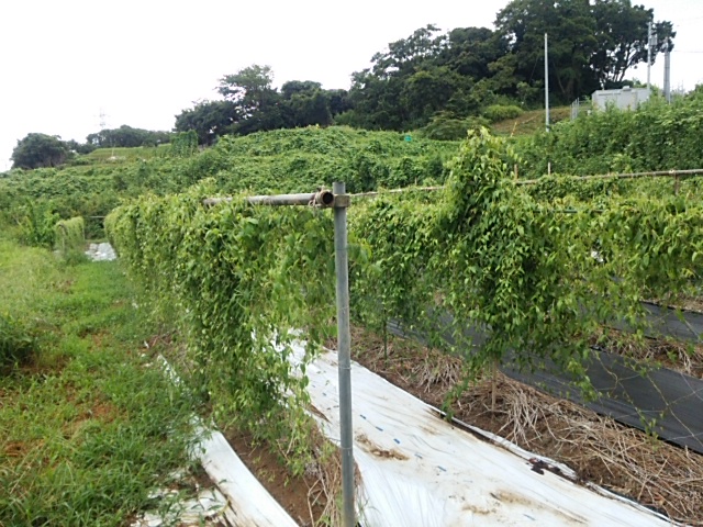 昨日1日中雨が降りました。本日は快晴。早速圃場に向かいました。昨日の雨で貯水槽の水がだいぶ溜まっていました。昨日の降雨:50mm程度。圃場の自然薯はご覧のように蔓葉が絡んで元気です。先週に追肥をやって良かったです。肥料が土壌に染み込んだものと思います。