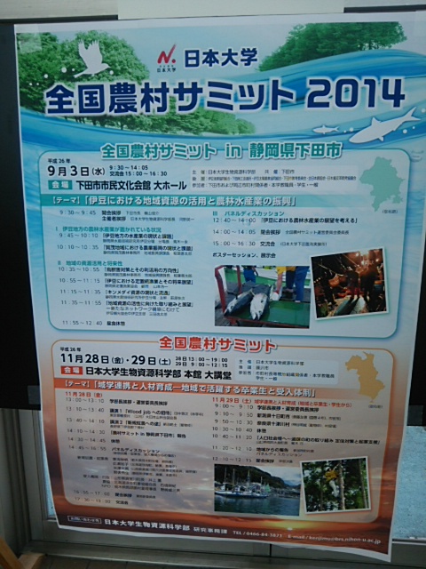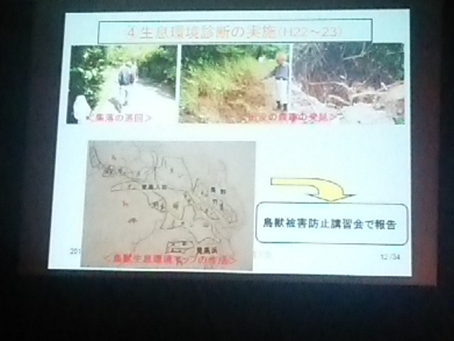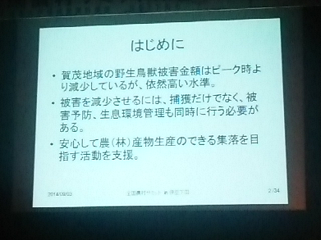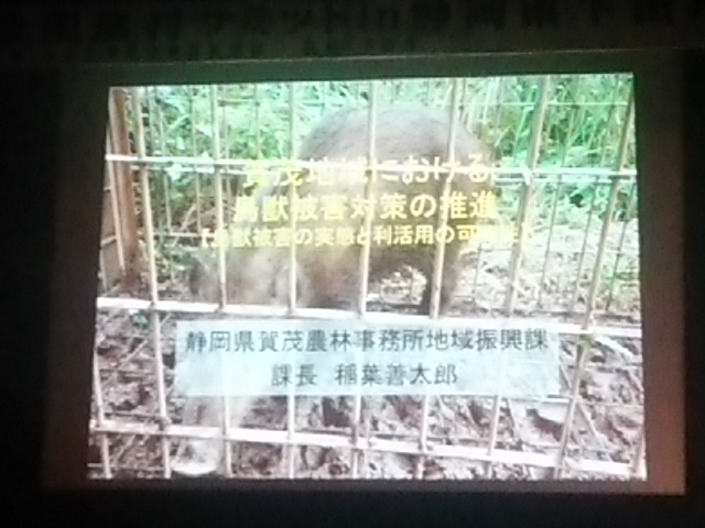 10:30−11:00 下田市文化会館で開催された全国農村サミットに参加しました。伊豆賀茂農林事務所の稲葉課長の講演:伊豆賀茂地域の獣害対策の現状と課題を主に聴講しました。大変分かり易く発表されて大変有意義でした。獣害対策ネットソリューションはHSSでビジネス化を検討しており資料や写真は関係者に配布しました。獣の生息状況マップや被害予想などを地域ごとに提供できると良いと感じました。
