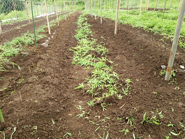午前中は第3列目と第4列目の畦に定植しました。約150本。土は雨ですっかり湿っており雑草を除去して定植と土寄せは比較的楽でした。午後は第1列と2列目の畦間に白黒マルチを敷設しました。畦には藁を敷きました。これが完成形です。これで雑草防止と保湿ができことになり後の作業が楽になるはずです。最後に第3圃場に行きました。案の定、水捌けが悪く畦間には水が溜まっています。足を踏み入れると15cmほど長靴が潜ってしまいます。しばらく様子を見ます。
