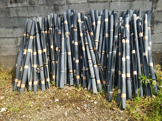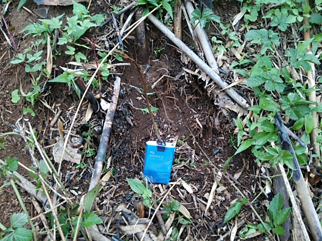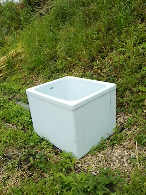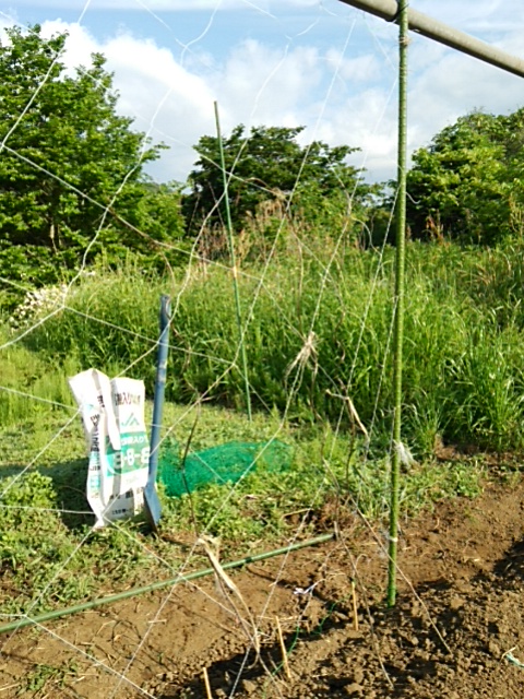 朝06:30圃場に行きました。大工のAさんが風呂タブを置いてくれていました。雨水を貯めるために使います。風呂栓と二つの穴を後日塞ぎます。Aさん:ありがとうございました。初めてネット張りしました。先日定植して1mほどに伸びた蔓をネットに絡めました。その後、3年物の種薯(1本種)を斜面に5本ほど植えました。作業完了:0800。