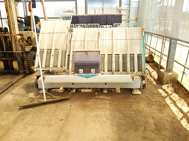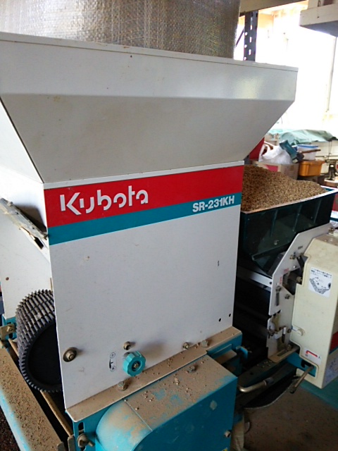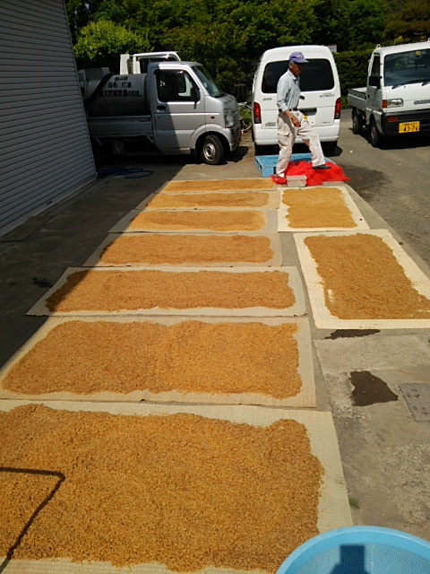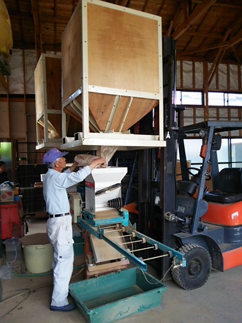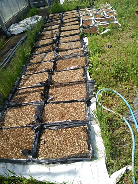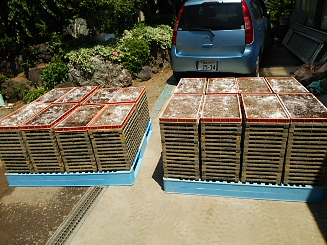 09:00から浜田牧場さんの水稲用の苗床の作成を手伝いました。従弟のOさんの自宅の庭で作成します。クボタのSR−231KHという播種機です。コンベアの端に苗箱を入れると培土入れ・ならし、育苗箱処理剤散布、播種、かん水、覆土まで自動で行ってくれる機械です。私は完成した苗床(ケース)を取り出して8ケース*15段に積み上げる作業を行いました。午前中に120ケース*4ケース:480ケースまで作成しました。1反:300坪で120ケース使用するのだそうです。種籾が1晩水に浸けて干してあります。