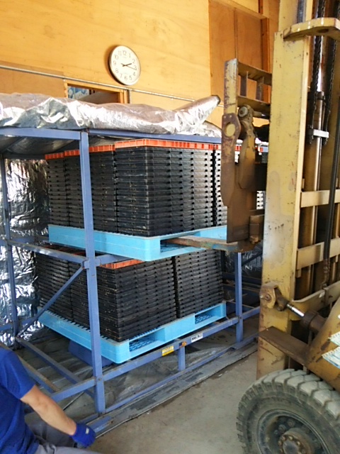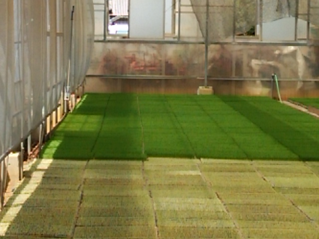 昼休みに芽が出た苗床を見せてくれました。手前が3日前に播いた苗床です。先の苗床はもう芽が3cmほどに伸びて緑色です。仕込んだ苗床は温風室にいれて30度の温度で保存するのだそうです。3昼夜で芽が出てからハウスに移すそうです。午後は残りの8ケース*15段分の種まきを行って作業が完了しました。15:00作業完了。非常に面白かったです。