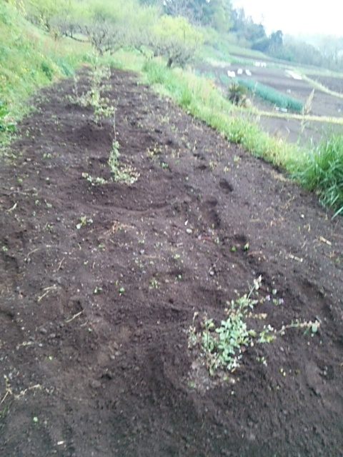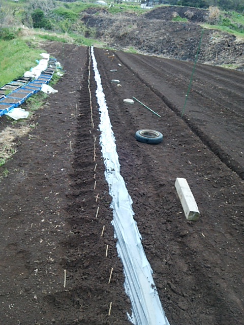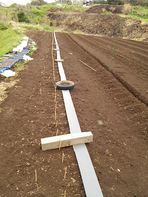 午前中に平塚に戻りました。月曜、火曜日も雨の予報の為、午後、1畦目の畦にマルチを布設しました。約1時間。