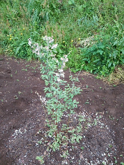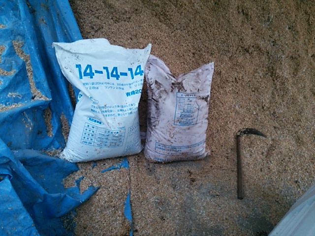 雨が上がり、晴れてきたため、H牧場さんのブルーベリーに施肥しました。化成肥料:14−14−14に硫安(窒素)を一握りずつ苗に施肥しました。また、移植1年目は果実を付けると苗が弱るためたくさんの花を除去しました。そうするとまた葉が伸びてくるそうです。1本だけ上の一部と下の一部の花はそのまま残してみました。
