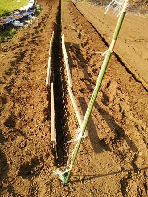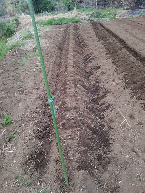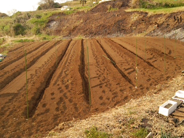 午後は畦の溝堀りをしました。トラクターでうなった後なので土は柔らかくて鍬での溝堀りは楽でした。2畦分の溝を掘りました。4対の金串を並べてみました。 14:00−17:00。明日も溝堀りを続けるつもりです。