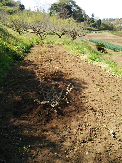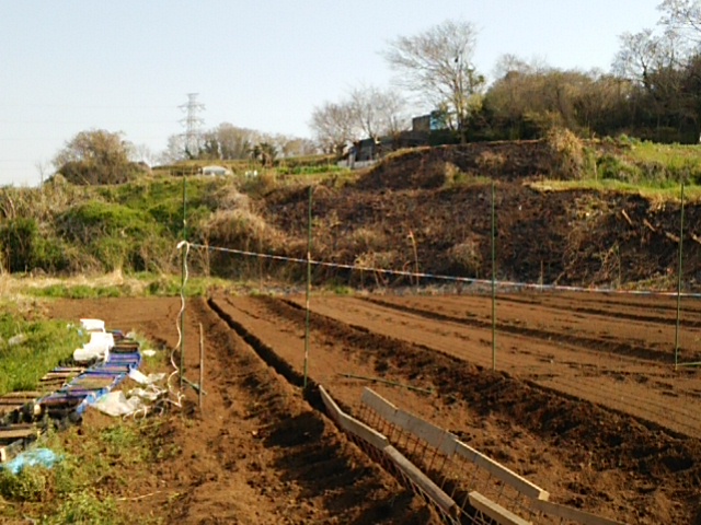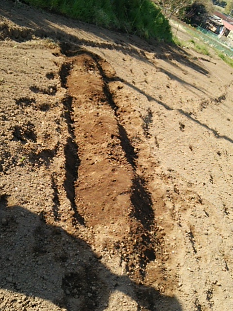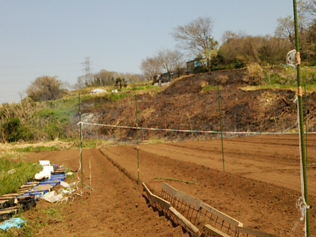 本日も快晴です。午前中は圃場の山側の斜面の残っていた雑木の土焼きをしました。火付きが悪く結局、一か所に手作業で集めてから焼きました。おかげで綺麗になりました。作業着は焼け残った雑木の煤で真っ黒。昼に洗濯しました。午後は圃場の畦の溝堀りです。7畦目の途中で手にマメができるになったので、終了としました。とても疲れました。管理機(溝堀り&土寄せ)が欲しくなりました。