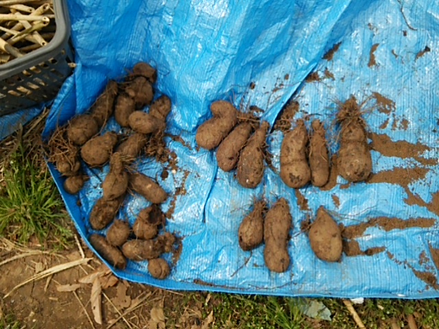 朝、H牧場さんのブルーベリー畑の草取りを実施しました。もうすっかり開花しています。今年は定植1年目なので実を結んでも摘果します。苗木に負担をかけなくするためです。来年の結実を確実にするためです。その後に第二圃場の脇の畦に九州のUさんから頂いたイチョウ薯を4個定植しました。イチョウ薯は大和薯と同種の薯で粘りが強い薯です。