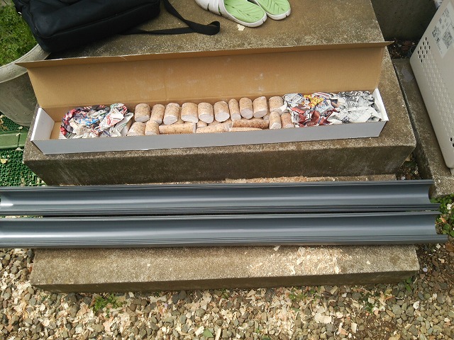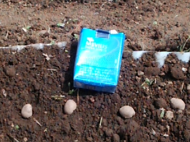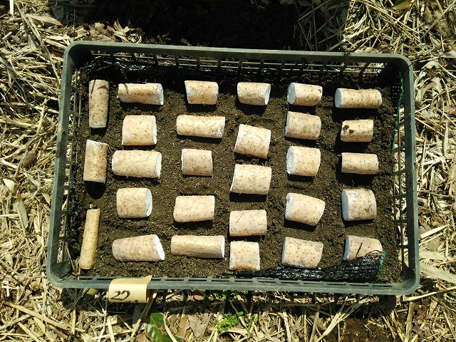 そして各波板の凹部にムカゴを1cmほどの深さに押し込みます。大きいムカゴだけ、一つおきに植えました。次に覆土します。最後は灌水して終了です。 18個*28枚+9個*4枚=540個定植しました。まだムカゴは残っています。これは後日定植します。