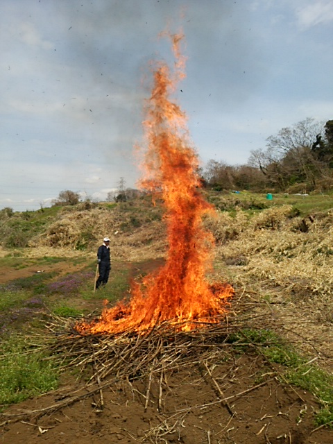 11:30−12:20。圃場の小竹を焼きました。あっという間に燃え上がりました。昼食を摂った後午後から畦シート作りです。先日北茨城から届いた特製の畦シート(先端が定植し易いように拡がっている)を観察しました。