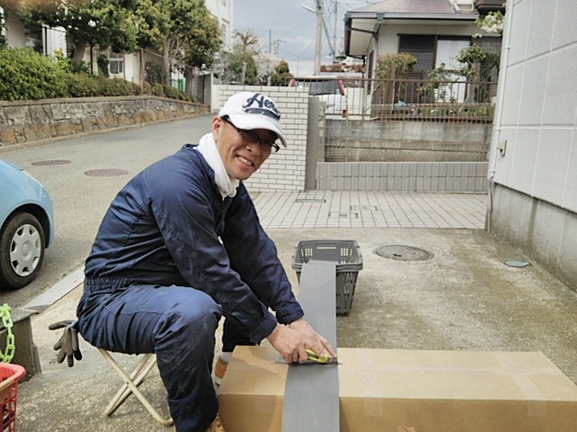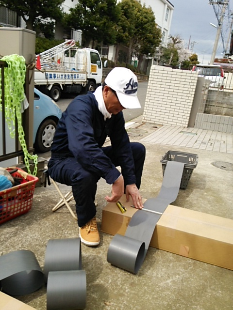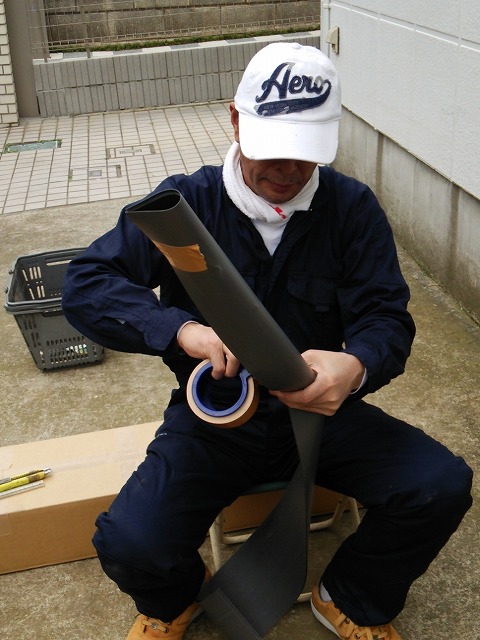 13:00-15:00 畦シート作りの実習を実施しました。特製の畦シート(幅15cm*長さ:50m)を1.4mの長さでカットします。カットした畦シートは3-4枚単位に折り曲げ布製のガムテープで留めます。(紙製のガムテープでは駄目で、広がる圧力ですぐに切れます。) そして中央を足で踏み固めて半分に折り目を入れます。特製の畦シートは後日こちらでも試作する方法も模索することにしました。