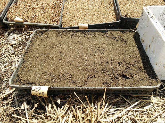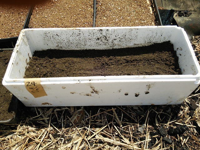 届いた種薯(カット済み)は圃場に行き、育苗箱に仕込みました。特長は箱の底に古新聞紙を敷き川砂を入れます。その上にカット薯を並べます。その上に川砂で覆砂します。2箱計50個を仕込みました。