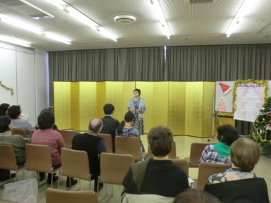 10月から参加している毎週木曜日の英語同好会のクリスマス会がありました。私のクラス:BUには多彩なタレントがいて楽しませてくれました。リンダ先生のショートストーリはクリスマスの思い出です。オーストラリアのクリスマスは夏の海辺やプールでとても違和感を感じたそうです。冬のクリスマスのイメージしかないのでその通りと思います。KTさんの日本舞踊(たまや)の艶やかさに驚かされました。次にOさんの啄木の歌『初恋』の熱唱に感動しました。最後にお孫さんのいるKSさんの若さあふれる;あまちゃんソング(&ダンス)にただただ吃驚しました。とても楽しい2時間でした。ありがとうございました。