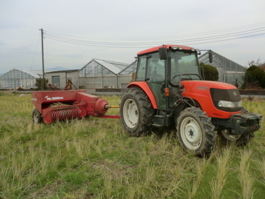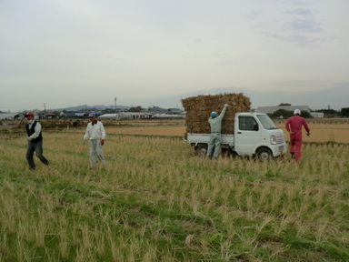 昼前には平塚に帰着しました。午後からは浜田牧場さんの藁の取り入れの手伝いを行いました。田圃に立て掛けた4本束の紐を切るのが私の手伝いです。それらをトラクターに付けた裁断機で乳牛の飼料として切って束ねるのです。四角形の束ねられた飼料藁は軽トラに積んで倉庫に運び込みます。これで1年の主な作業は終わることになります。