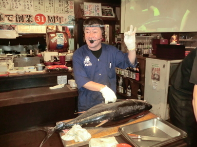 夕方、都内のIT会社のNさんを訪ね贈答用自然薯注文の御礼に伺いしました。近く有名な居酒屋:たいこ茶屋に招待してくれました。大将は仙台出身で東北震災の被災者の支援を行っています。大将自慢のマグロの解体ショウを見せてくれました。売上の一部を被災者支援に充てているのだそうです。魚中心の小料理ですが、月曜というのに満席でした。じゃんけん大会で勝って大将自慢のストラップを頂きました。とても楽しいひと時でした。Nさんそして会社のkさん、yさん;ありがとうございました。