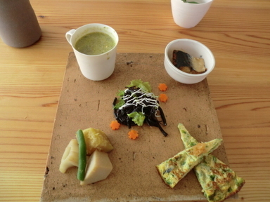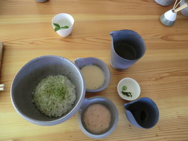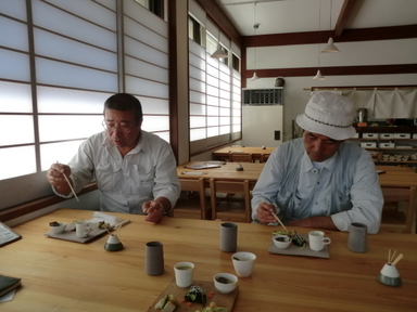 おおむろ食堂様でランチを摂ることにしました。自慢の紅白麦とろ丼を食べました。前採プレートとデザート&テイー(抹茶)が付いて1,350円と手ごろな値段です。地元のTさんとHさんと3人で一緒に頂きました。茶碗類はすべてえんのかま(陶芸工房)で製作されたものでとてもおしゃれなものばかりでした。とても美味しく頂きました。都会からの誘客の支援をお約束しました。今後ともよろしくお願いします。