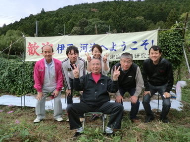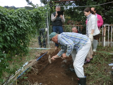 都内在住のBさん一行7名が18日ー19日伊豆に来られました。川奈でGolfをした一行は夕方に河津入り。夜は上佐ヶ野のTIPIキャンプで鹿肉のBBQを堪能頂きました。峰の夢セン(夢支援センター)に泊り、朝09:00にお迎えに行きました。チェックアウト後玄関で記念写真を撮りました。その後、自然薯圃場に案内して早速自然薯掘りを開始しました。Tさんが見本を見せた後、Sさんが薯掘りを開始しました。