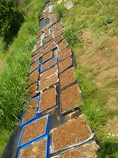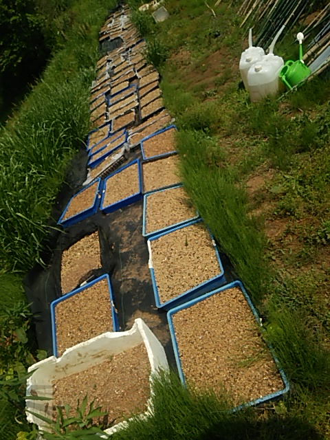 07:00-08:00。第1圃場の育苗箱の灌水を行い、蔓が50cmほどに延びた自然薯を定植しました。頭部のカット薯でサイズが100gの程の種薯は発芽が早いようです。うまく活着するように定植後にたっぷり水をあげました。