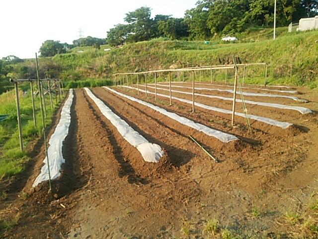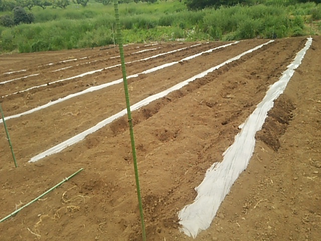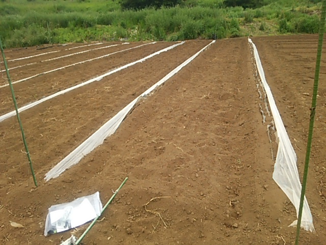 08:3-10:30。第二圃場の透明マルチの整形をしました。シートピンが少なくなったので、シートピンでマルチを抑えながら直接に土寄せしてマルチが剥がれないように整形しました。
