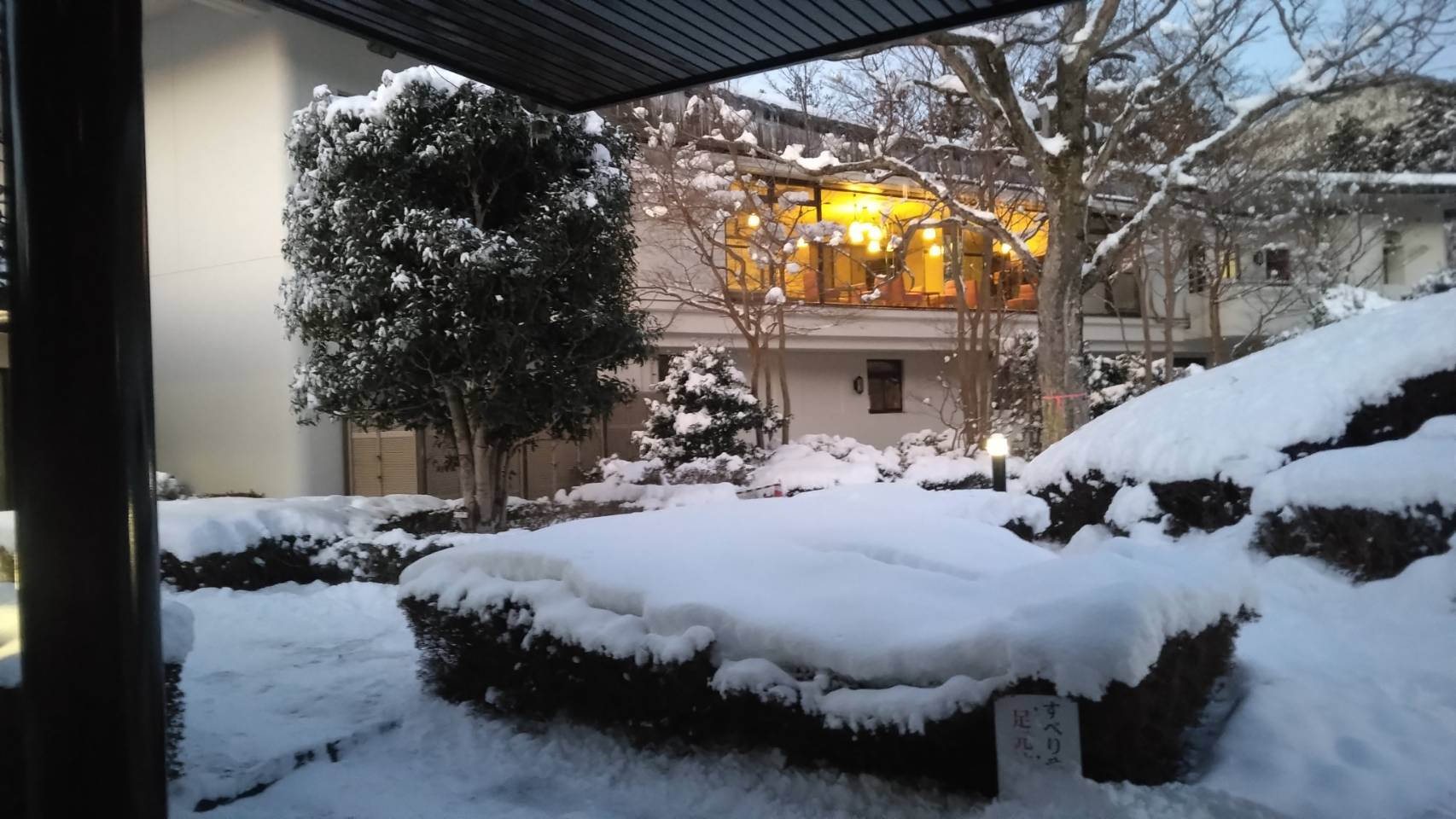 | 2/9箱根の保養所/Hakone resort hotel | | | | 熊本からきている息子と孫を箱根の宮城野保養所に案内しました。あいにく数年に一度の大雪が降り、急遽、市内でタイヤチェーンを買い求め、午後早めに出発しましたが、猛烈な渋滞に巻き込まれ5時間以上もかけてやっと宿に辿り着くことができました。おかげで美しい雪の風景を楽しむことができました。 Took my son and grandson, who came from Kumamoto, to Miyagino Retreat Home in Hakone. Unfortunately, there was a heavy snowfall that only happens once every several years, so quickly bought tire chains in the city and left early in the afternoon. However, got caught in a terrible traffic jam and it took us more than five hours to finally reach the inn. Thanks to that, we were able to enjoy the beautiful snowy scenery. |