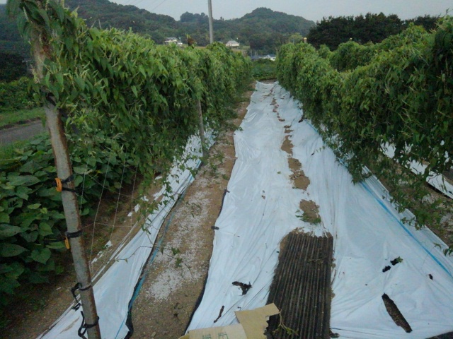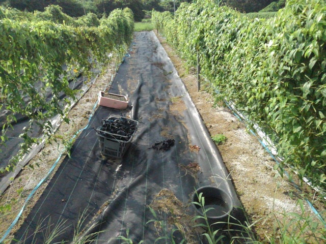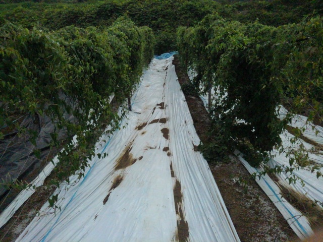 自然薯の追肥をしました。第一圃場、第二圃場、第四圃場の各畦上に平均50g/蔓の化成肥料8-8-8を散布しました。今年は順調に生育しています。