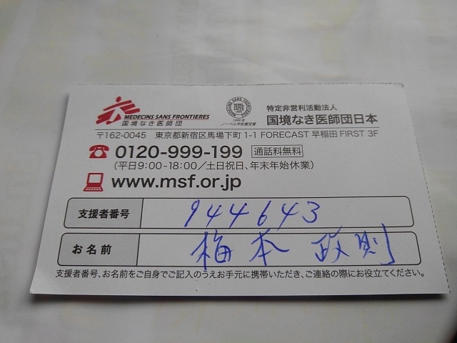先日寄付した医師団から支援者カードが送られてきました。少しでもお役に立てればと思います。