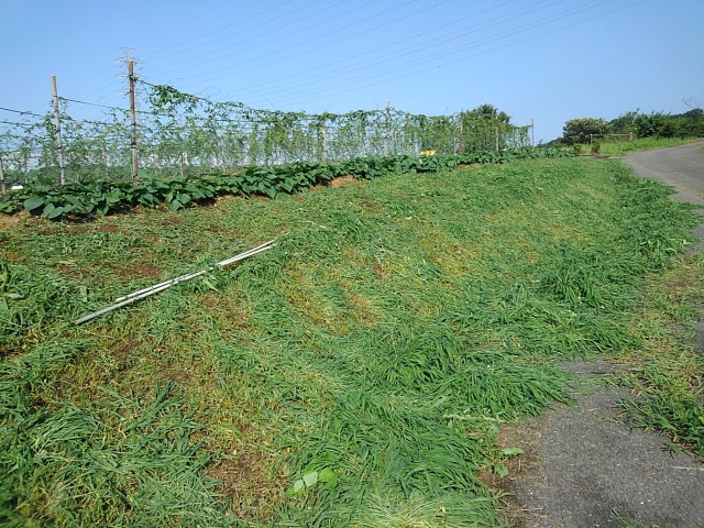 梅雨の雨が上がったため草刈りを実施しました。第1圃場脇と斜面、第3圃場圃場脇そして第4圃場の斜面を昼を挟んで4時間かけて実施しました。今年は梅雨がが長く2週間おきに草刈りを実施することになります。