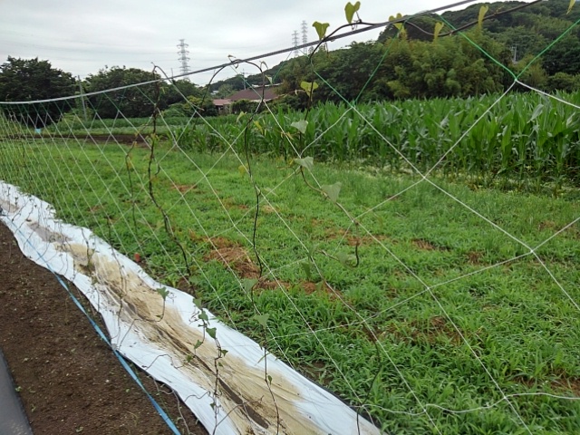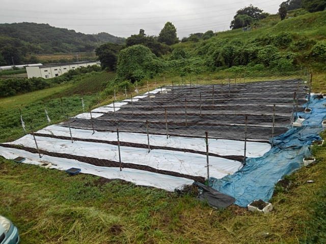 第二圃場の自然薯の蔓の養生を実施しました。ネット上部を越えて伸びた蔓をネットに絡ましたりすることを蔓の養生と呼びます。ほっておくと蔓先頭が折れてしまうことがあります。第1圃場も実施しました。この作業は1時間/圃場以内で実施でき、自然薯の成長を観察できる楽しい作業です。第1圃場の俯瞰写真です。